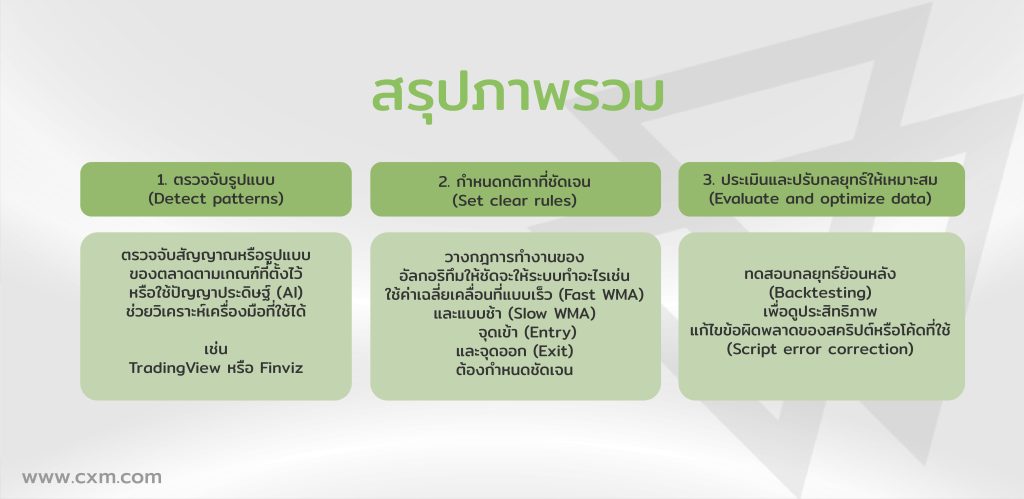 ทุกอย่างเริ่มจากสมมติฐานง่ายๆ เช่น “เมื่อ RSI ข้ามค่าเฉลี่ยเคลื่อนที่ ราคามักจะขึ้น” ใช้ข้อมูลย้อนหลังจาก TradingView หรือ FinViz เพื่อรวบรวมข้อมูลที่จะป้อนให้กับอัลกอริทึม ChatGPT จะช่วยแปลงสมมติฐานนี้เป็นกฎที่ชัดเจน